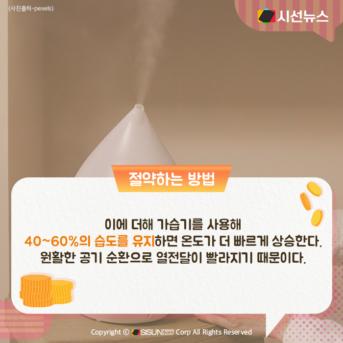 특히 높은 온도에 맞춰 두었다가 더워져 껐다가 재가동할 때 가스 소비량이 많아진다. 집을 비울 때도 마찬가지로 보일러를 아예 끄기보다는 외출모드를 활용해 실내에 최소한의 온기가 유지될 수 있도록 하는 게 더 좋다. 이에 더해 가습기를 사용해 40~60%의 습도를 유지하면 온도가 더 빠르게 상승한다. 원활한 공기 순환으로 열전달이 빨라지기 때문이다.