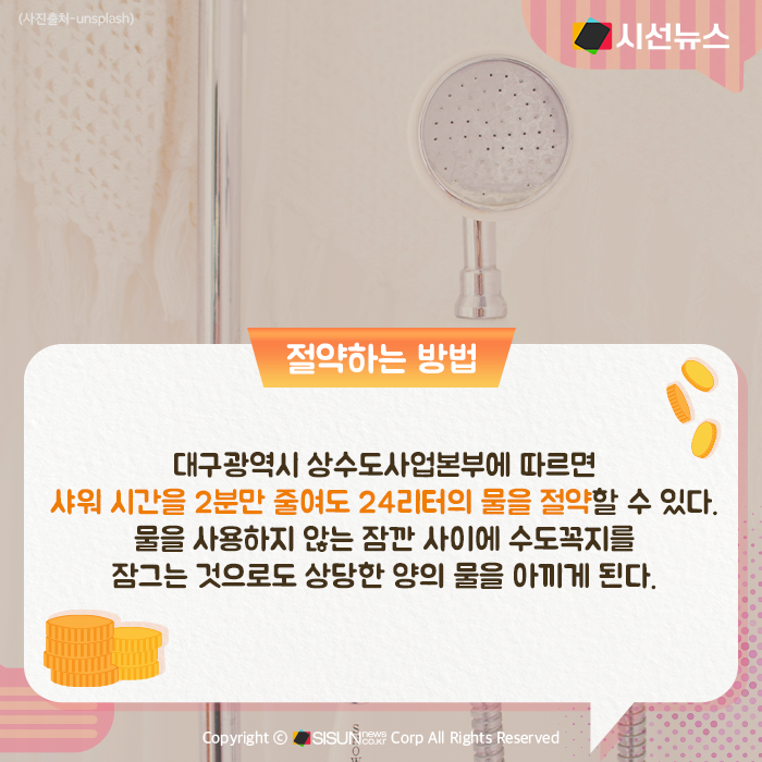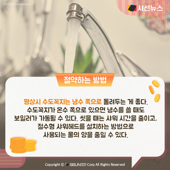 평상시 수도꼭지는 냉수 쪽으로 돌려두는 게 좋다. 수도꼭지가 온수 쪽으로 있으면 냉수를 쓸 때도 보일러가 가동될 수 있다. 씻을 때는 샤워 시간을 줄이고, 절수형 샤워헤드를 설치하는 방법으로 사용되는 물의 양을 줄일 수 있다. 대구광역시 상수도사업본부에 따르면 샤워 시간을 2분만 줄여도 24리터의 물을 절약할 수 있다. 물을 사용하지 않는 잠깐 사이에 수도꼭지를 잠그는 것으로도 상당한 양의 물을 아끼게 된다.