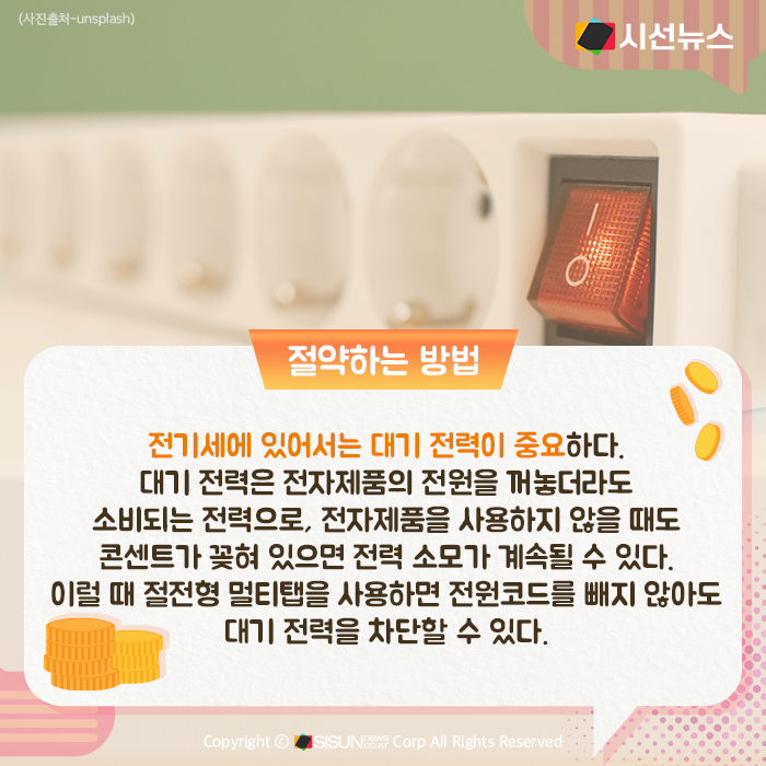 전기세에 있어서는 대기 전력이 중요하다. 대기 전력은 전자제품의 전원을 꺼놓더라도 소비되는 전력으로, 전자제품을 사용하지 않을 때도 콘센트가 꽂혀 있으면 전력 소모가 계속될 수 있다. 이럴 때는 절전형 멀티탭을 사용하면 전원코드를 빼지 않아도 대기 전력을 차단할 수 있다. 다만 모든 전자제품에 대기전력이 있는 것은 아닌데, 이는 제품의 전원 모양을 통해 확인할 수 있다.
