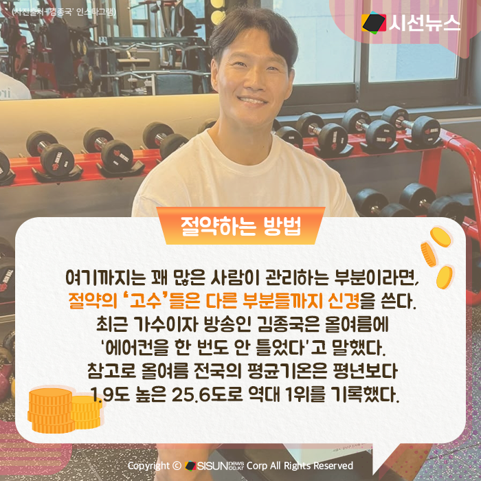 여기까지는 꽤 많은 사람이 관리하는 부분이라면, 절약의 ‘고수’들은 다른 부분들까지 신경을 쓴다. 최근 가수이자 방송인 김종국은 올여름에 “에어컨을 한 번도 안 틀었다”고 말했다. 참고로 올여름 전국의 평균기온은 평년보다 1.9도 높은 25.6도로 역대 1위를 기록했다. 김종국은 물티슈를 빨아 쓰는 등 알뜰한 생활 습관과 그 영향력을 인정받아 지난 10월 제9회 ‘금융의 날’ 기념식에서 대통령 표창을 받기도 했다.