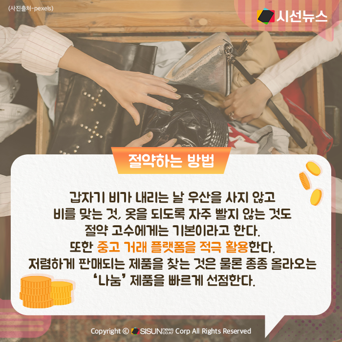 갑자기 비가 내리는 날 우산을 사지 않고 비를 맞는 것, 옷을 되도록 자주 빨지 않는 것도 절약 고수에게는 기본이라고 한다. 또한 중고 거래 플랫폼을 적극 활용한다. 저렴하게 판매되는 제품을 찾는 것은 물론 종종 올라오는 ‘나눔’ 제품을 빠르게 선점한다.