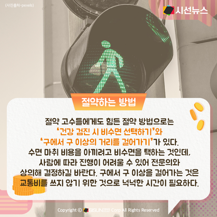 절약 고수들에게도 힘든 절약 방법으로는 ‘건강 검진 시 비수면 선택하기’와 ‘구에서 구 이상의 거리를 걸어가기’가 있다. 수면 마취 비용을 아끼려고 비수면을 택하는 것인데, 사람에 따라 진행이 어려울 수 있어 전문의와 상의해 결정하길 바란다. 구에서 구 이상을 걸어가는 것은 교통비를 쓰지 않기 위한 것으로 넉넉한 시간이 필요하다. 한강을 건널 경우 더 많은 시간과 체력이 준비되어야 한다.