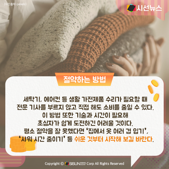 세탁기, 에어컨 등 생활 가전제품 수리가 필요할 때 전문 기사를 부르지 않고 직접 해도 소비를 줄일 수 있다. 이 방법 또한 기술과 시간이 필요해 초심자가 쉽게 도전하긴 어려울 것이다. 평소 절약을 잘 못했다면 ‘집에서 옷 여러 겹 입기’, ‘샤워 시간 줄이기’ 등 쉬운 것부터 시작해 보길 바란다.