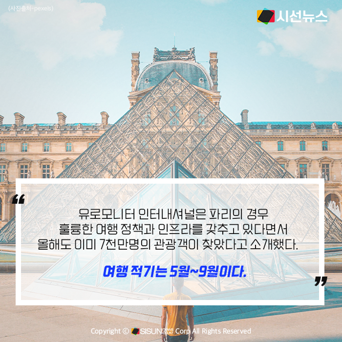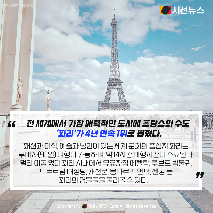 전 세계에서 가장 매력적인 도시에 프랑스의 수도 ‘파리’가 4년 연속 1위로 뽑혔다. 패션과 미식, 예술과 낭만이 있는 세계 문화의 중심지 파리는 무비자(90일) 여행이 가능하며, 약 14시간 비행시간이 소요된다. 멀리 이동 없이 파리 시내에서 유유자적 에펠탑, 루브르 박물관, 노트르담 대성당, 개선문, 몽마르뜨 언덕, 센강 등 파리의 명물들을 둘러볼 수 있다. 유로모니터 인터내셔널은 파리의 경우 훌륭한 여행 정책과 인프라를 갖추고 있다면서 올해 들어서도 이미 7천만명의 관광객이 찾았다고 소개했다. 여행 적기는 5월~9월이다.