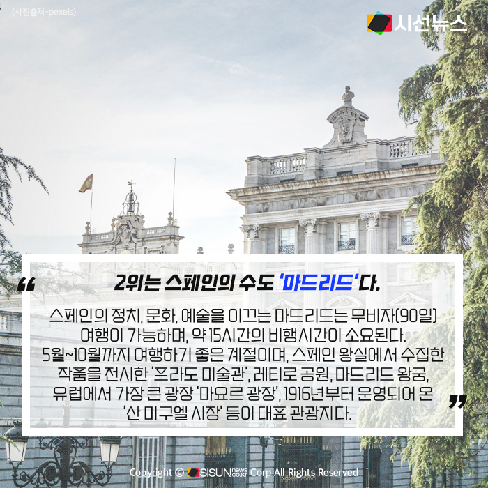 2위는 스페인의 수도 ‘마드리드’다. 스페인의 정치, 문화, 예술을 이끄는 마드리드는 무비자(90일) 여행이 가능하며, 약 15시간의 비행시간이 소요된다. 5월~10월까지 여행하기 좋은 계절이며, 스페인 왕실에서 수집한 작품을 전시한 ‘프라도 미술관’, 레티로 공원, 마드리드 왕궁, 유럽에서 가장 큰 광장 ‘마요르 광장’, 1916년부터 운영되어 온 ‘산 미구엘 시장’ 등이 대표 관광지다.