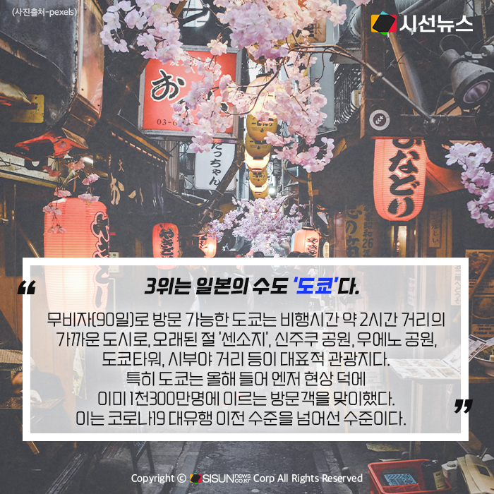 3위는 일본의 수도 ‘도쿄’다. 무비자(90일)로 방문 가능한 도쿄는 비행시간 약 2시간 거리의 가까운 도시로, 오래된 절 ‘센소지’, 신주쿠 공원, 우에노 공원, 도쿄타워, 시부야 거리 등이 대표적 관광지다. 특히 도쿄는 올해 들어 엔저 현상 덕에 이미 1천300만명에 이르는 방문객을 맞이했다. 이는 코로나19 대유행 이전 수준을 넘어선 수준이다.