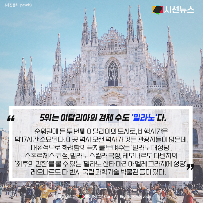 5위는 이탈리아의 경제 수도로 불리는 ‘밀라노’다. 순위권에 든 두 번째 이탈리아의 도시로, 비행시간은 약 17시간 소요된다. 이곳 역시 오랜 역사가 깃든 관광지들이 많은데, 대표적으로 화려함의 극치를 보여주는 ‘밀라노 대성당’, 스포르체스코 성, 밀라노 스칼라 극장, 레오나르도 다빈치의 ‘최후의 만찬’을 볼 수 있는 ‘밀라노 산타 마리아 델레 그라치에 성당’, 레오나르도 다 빈치 국립 과학기술 박물관 등이 있다.