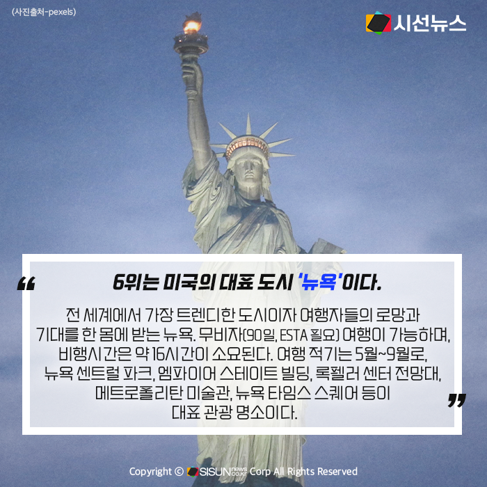 6위는 미국의 대표 도시 ‘뉴욕’이다. 전 세계에서 가장 트렌디한 도시이자 여행자들의 로망과 기대를 한 몸에 받는 뉴욕. 무비자(90일, ESTA 필요) 여행이 가능하며, 비행시간은 약 16시간이 소요된다. 여행 적기는 5월~9월로, 뉴욕 센트럴 파크, 엠파이어 스테이트 빌딩, 록펠러 센터 전망대, 메트로폴리탄 미술관, 뉴욕 타임스 스퀘어 등이 대표 관광 명소이다.