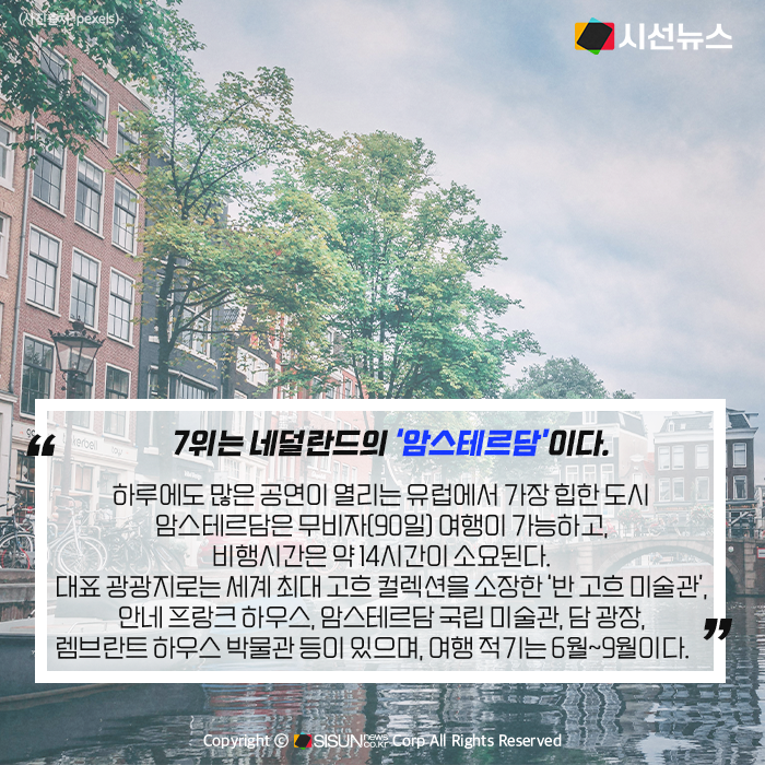 7위는 네덜란드의 ‘암스테르담’이다. 하루에도 많은 공연이 열리는 유럽에서 가장 힙한 도시 암스테르담은 무비자(90일) 여행이 가능하고, 비행시간은 약 14시간이 소요된다. 대표 광광지로는 세계 최대 고흐 컬렉션을 소장한 ‘반 고흐 미술관’, 안네 프랑크 하우스, 암스테르담 국립 미술관, 담 광장, 렘브란트 하우스 박물관 등이 있으며, 여행 적기는 6월~9월이다.