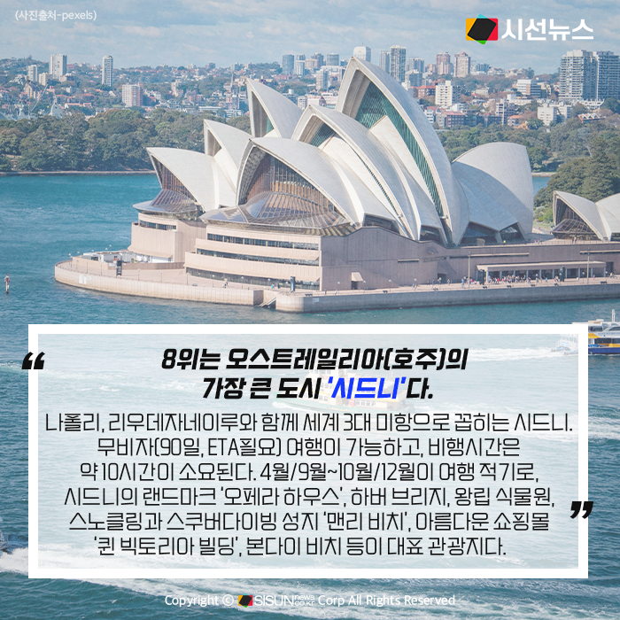 8위는 오스트레일리아(호주)의 가장 큰 도시 ‘시드니’다. 나폴리, 리우데자네이루와 함께 세계 3대 미항으로 꼽히는 시드니. 무비자(90일, ETA필요) 여행이 가능하고, 비행시간은 약 10시간이 소요된다. 4월/9월~10월/12월이 여행 적기로, 시드니의 랜드마크 ‘오페라 하우스’, 하버 브리지, 왕립 식물원, 스노클링과 스쿠버다이빙 성지 ‘맨리 비치’, 아름다운 쇼핑몰 ‘퀸 빅토리아 빌딩’, 본다이 비치 등이 대표 관광지다.