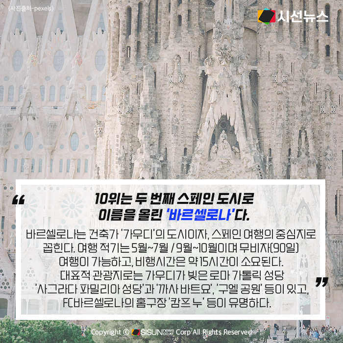 10위는 두 번째 스페인 도시로 이름을 올린 ‘바르셀로나’다. 바르셀로나는 건축가 ‘가우디’의 도시이자, 스페인 여행의 중심지로 꼽힌다. 여행 적기는 5월~7월 / 9월~10월이며 무비자(90일) 여행이 가능하고, 비행시간은 약 15시간이 소요된다. 대표적 관광지로는 가우디가 빚은 로마 가톨릭 성당 ‘사그라다 파밀리아 성당’과 ‘까사 바트요’, ‘구엘 공원’ 등이 있고, FC바르셀로나의 홈구장 ‘캄프 누’ 등이 유명하다.