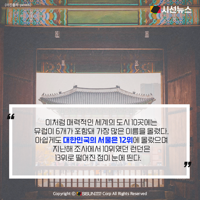 이처럼 매력적인 세계의 도시 10곳에는 유럽이 6개가 포함돼 가장 많은 이름을 올렸다. 아쉽게도 대한민국의 서울은 12위에 올랐으며 지난해 조사에서 10위였던 런던은 13위로 떨어진 점이 눈에 띈다.