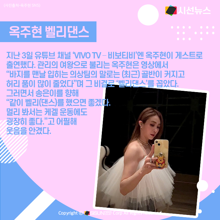 지난 3일 유튜브 채널 ‘VIVO TV – 비보티비’엔 옥주현이 게스트로 출연했다. 관리의 여왕으로 불리는 옥주현은 영상에서 “바지를 맨날 입히는 의상팀의 말로는 (최근) 골반이 커지고 허리 품이 많이 줄었다”며 그 비결로 ‘벨리댄스’를 꼽았다. 그러면서 송은이를 향해 “같이 벨리(댄스)를 했으면 좋겠다. 멀리 봐서는 케겔 운동에도 굉장히 좋다.”고 어필해 웃음을 안겼다.