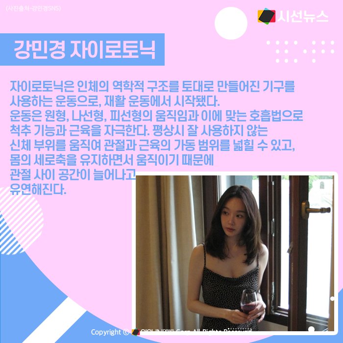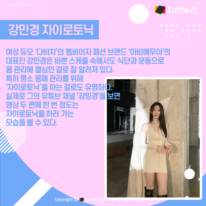 여성 듀오 ‘다비치’의 멤버이자 패션 브랜드 ‘아비에무아’의 대표인 강민경은 바쁜 스케줄 속에서도 식단과 운동으로 몸 관리에 열심인 걸로 잘 알려져 있다. 특히 평소 몸매 관리를 위해 ‘자이로토닉’을 하는 걸로도 유명하다. 실제로 그의 유튜브 채널 ‘걍밍경’을 보면 영상 두 편에 한 번 정도는 자이로토닉을 하러 가는 모습을 볼 수 있다.