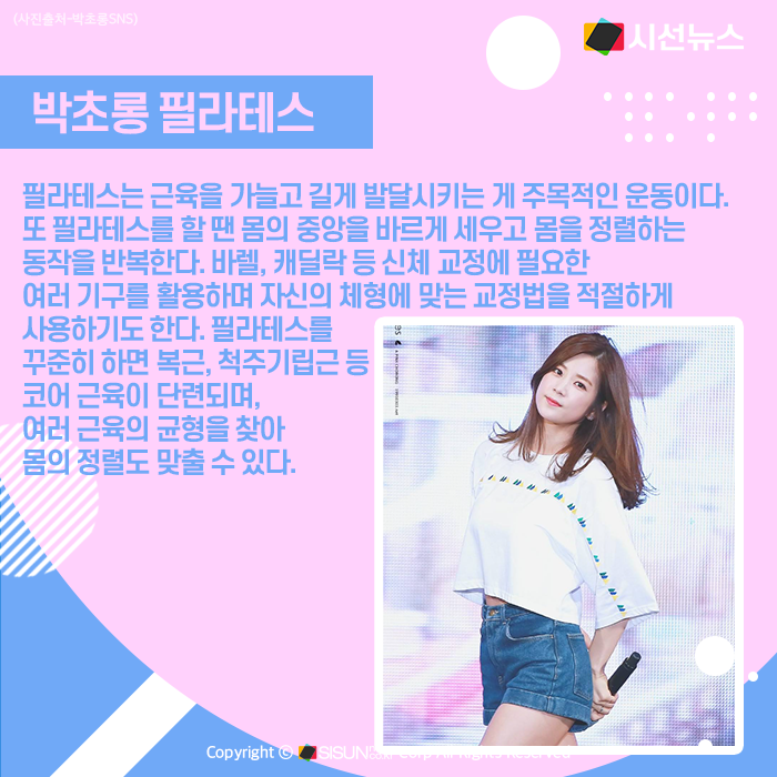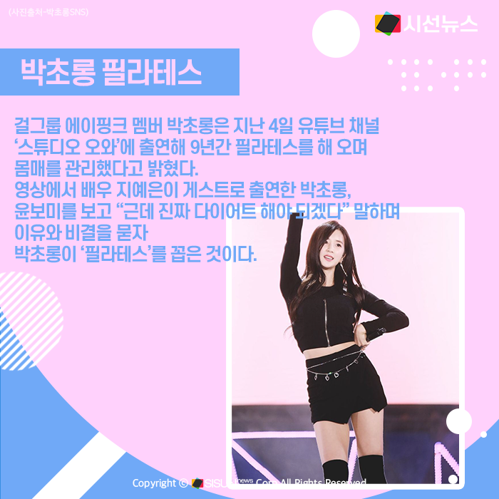 걸그룹 에이핑크 멤버 박초롱은 지난 4일 유튜브 채널 ‘스튜디오 오와’에 출연해 9년간 필라테스를 해 오며 몸매를 관리했다고 밝혔다. 영상에서 배우 지예은이 게스트로 출연한 박초롱, 윤보미를 보고 “근데 진짜 다이어트 해야 되겠다” 말하며 이유와 비결을 묻자 박초롱이 ‘필라테스’를 꼽은 것이다.