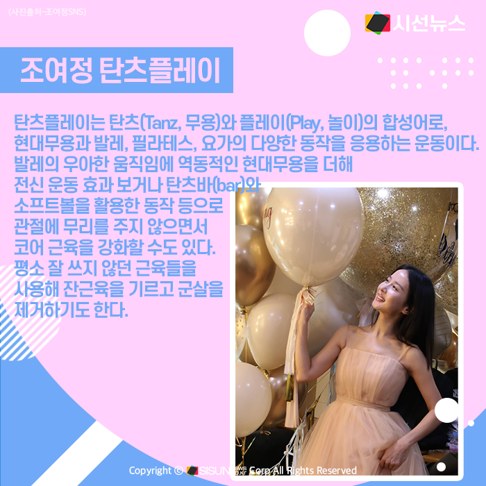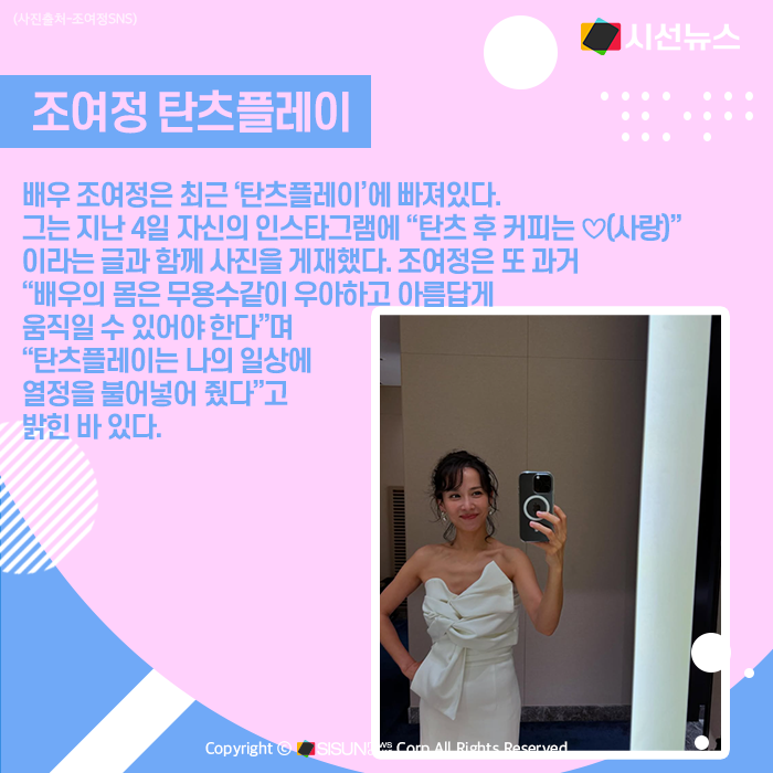 배우 조여정은 최근 ‘탄츠’에 빠져있다. 그는 지난 4일 자신의 인스타그램에 “탄츠 후 커피는 ♡(사랑)”이라는 글과 함께 사진을 게재했다. 조여정은 또 과거 “배우의 몸은 무용수같이 우아하고 아름답게 움직일 수 있어야 한다”며 “탄츠플레이는 나의 일상에 열정을 불어넣어 줬다”고 밝힌 바 있다.