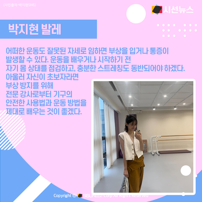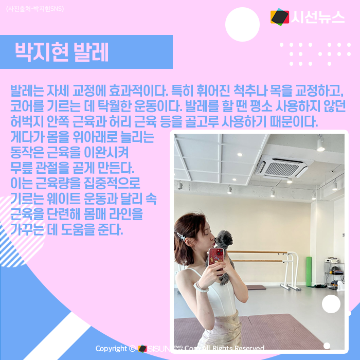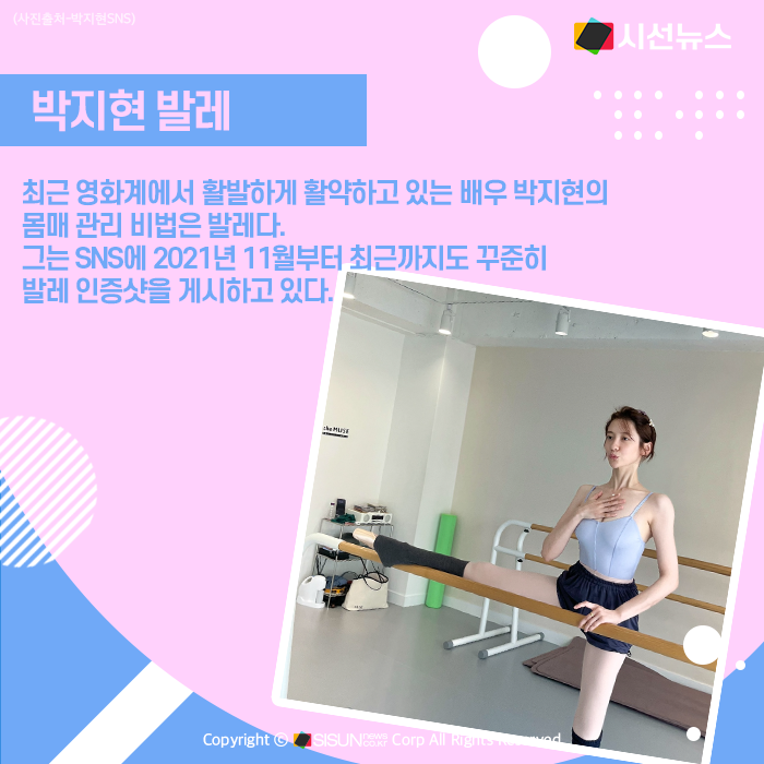 최근 영화판에서 활약하고 있는 배우 박지현의 몸매 관리 비법은 발레다. 그는 SNS에 2021년 11월부터 최근까지도 꾸준히 발레 인증샷을 게시하고 있다.
