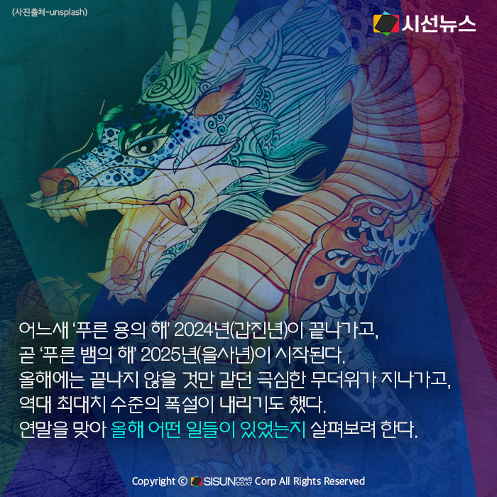 시선뉴스=정혜인 기자 / 디자인=김선희 proㅣ어느새 ‘푸른 용의 해’ 2024년(갑진년)이 끝나가고, 곧 ‘푸른 뱀의 해’ 2025년(을사년)이 시작된다. 올해에는 끝나지 않을 것만 같던 극심한 무더위가 지나가고, 역대 최대치 수준의 폭설이 내리기도 했다. 연말을 맞아 올해 어떤 일들이 있었는지 살펴보려 한다.
