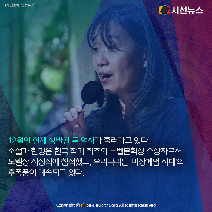 12월인 현재 상반된 두 역사가 흘러가고 있다. 소설가 한강은 한국 작가 최초의 노벨문학상 수상자로서 노벨상 시상식에 참석했고, 우리나라는 ‘비상계엄 사태’의 후폭풍이 계속되고 있다. 한국 내 상황에 대해 한강은 “이번 일로 시민들이 보여준 진심과 용기 때문에 감동을 많이 했다. 그래서 이 상황이 끔찍하다고만 생각하진 않는다”고 말하기도 했다.