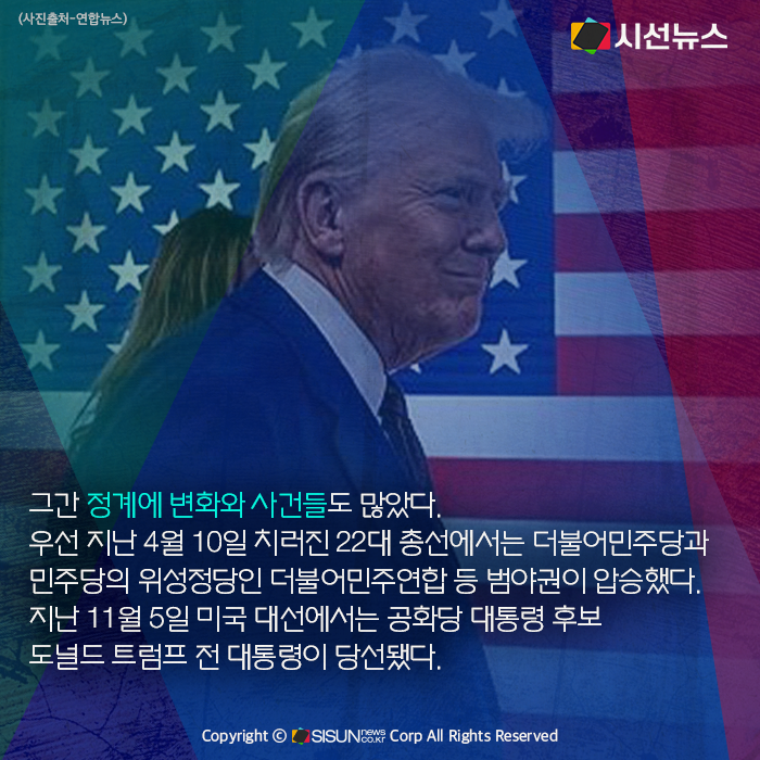 그간 정계에 변화와 사건들도 많았다. 우선 지난 4월 10일 치러진 22대 총선에서는 더불어민주당과 민주당이 위성정당인 더불어민주연합 등 범야권이 압승했다. 지난 11월 5일 미국 대선에서는 공화당 대통령 후보 도널드 트럼프 전 대통령이 당선됐다. 이에 앞서 더불어민주당 이재명 대표가 흉기로 습격당한 사건이 지난 1월에 있었고, 트럼프 당선인이 대선 전 유세를 벌이던 중 피격 사건이 발생한 바 있다.