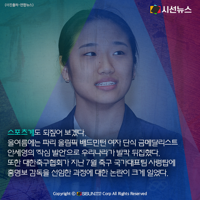 스포츠계도 되짚어 보겠다. 지난 7월 11일부터 8월 11일까지 파리 올림픽이 개최됐는데, 우리나라는 배드민턴 여자 단식 금메달리스트 안세영의 ‘작심 발언’으로 발칵 뒤집혔다. 결국 검찰과 경찰은 그간 체육계에서 불거진 비리 의혹들에 대해 동시다발적으로 수사에 착수했다. 또한 대한축구협회가 지난 7월 축구 국가대표팀 사령탑에 홍명보 감독을 선임했는데, 그 선임 과정에 대한 논란이 크게 일었다.