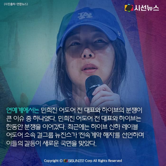 연예계에서는 민희진 어도어 전 대표와 하이브의 분쟁이 큰 이슈 중 하나였다. 지난 4월, 하이브는 민희진 어도어 전 대표를 상대로 내부 감사를 진행했다. 이들은 한동안 분쟁을 이어갔고, 이에 하이브 산하 레이블 어도어 소속 걸그룹 뉴진스의 활동이 불투명해졌다는 전망이 나왔다. 결국 뉴진스가 ‘전속계약 해지’를 선언하며 이들의 갈등은 새로운 국면을 맞았다.