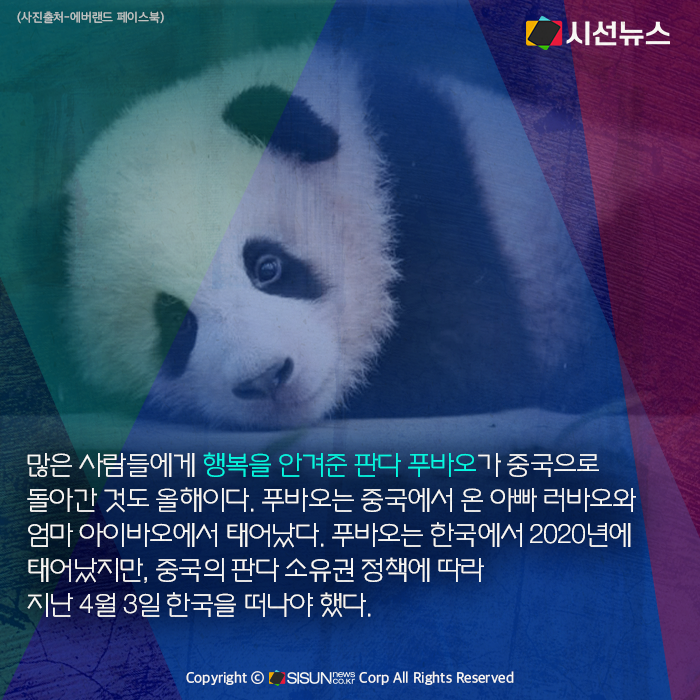 많은 사람들에게 행복을 안겨준 판다 푸바오가 중국으로 돌아간 것도 올해이다. 푸바오는 중국에서 온 아빠 러바오와 엄마 아이바오에서 태어났다. 푸바오는 한국에서 2020년에 태어났지만, 중국의 판다 소유권 정책에 따라 지난 4월 3일 한국을 떠나야 했다. 이후 중국으로 간 푸바오가 열악한 대우를 받고 있다는 의혹이 제기된 바 있다. 중국 당국은 직접 반박하거나 푸바오 영상을 공개하면서 이를 해명했다.