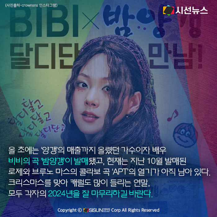 올 초에는 ‘양갱’의 매출까지 올렸던 가수이자 배우 비비의 곡 ‘밤양갱’이 발매됐고, 현재는 지난 10월 발매된 로제와 브루노 마스의 콜라보 곡 ‘APT’의 열기가 아직 남아 있다. 크리스마스를 맞아 캐럴도 많이 들리는 연말, 모두 각자의 2024년을 잘 마무리하길 바란다.