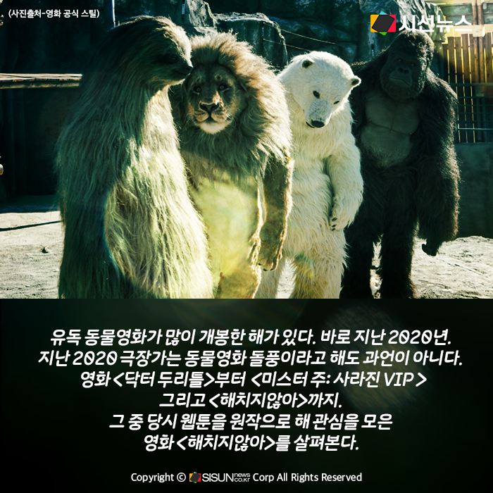 2020 극장가는 동물영화 돌풍이라고 해도 과언이 아니다. 영화 <닥터 두리틀>부터 <미스터 주: 사라진 VIP 그리고 <해치지않아>까지. 우리의 삶 깊숙이 함께하는 동물들이 나오는 영화는 어떨까? 웹툰을 원작으로 해 관심을 모은 영화 <해치지않아>를 살펴본다.