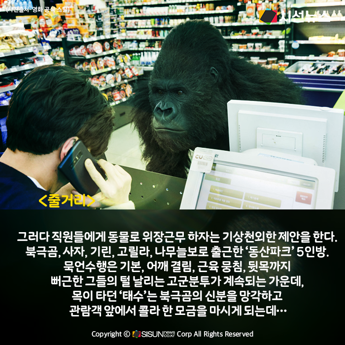 그러다 직원들에게 동물로 위장근무 하자는 기상천외한 제안을 한다. 북극곰, 사자, 기린, 고릴라, 나무늘보로 출근한 ‘동산파크’ 5인방. 묵언수행은 기본, 어깨 결림, 근육 뭉침, 뒷목까지 뻐근한 그들의 털 날리는 고군분투가 계속되는 가운데, 목이 타던 ‘태수’는 북극곰의 신분을 망각하고 관람객 앞에서 콜라 한 모금을 마시게 되는데…