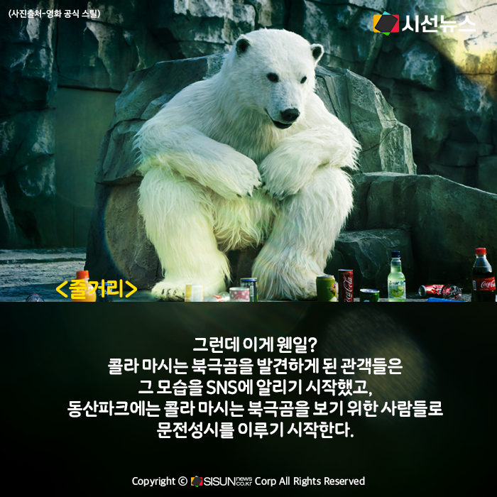 그런데 이게 웬일? 콜라 마시는 북극곰을 발견하게 된 관객들은 그 모습을 SNS에 알리기 시작했고, 동산파크에는 콜라 마시는 북극곰을 보기 위한 사람들로 문전성시를 이루기 시작한다.