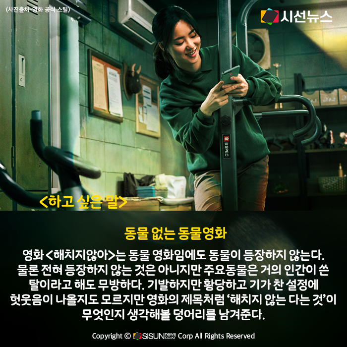2020년 유독 많이 개봉한 동물영화들. 아이러니 하게도 영화 <해치지않아>는 동물 영화임에도 동물이 등장하지 않는다. 물론 전혀 등장하지 않는 것은 아니지만 주요동물은 거의 인간이 쓴 탈이라고 해도 무방하다. 동물의 삶이 되어본다는 것. 기발하지만 황당하고 기가 찬 설정에 헛웃음이 나올지도 모르겠지만 영화의 제목처럼 ‘해치지 않는 다는 것’이 무엇인지 생각해볼 덩어리를 남겨준다.