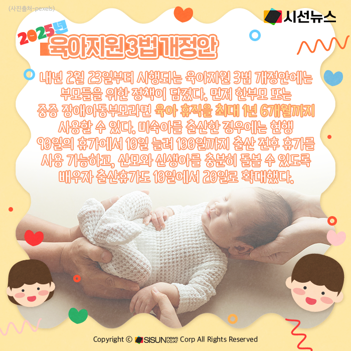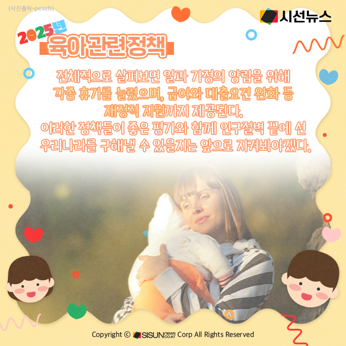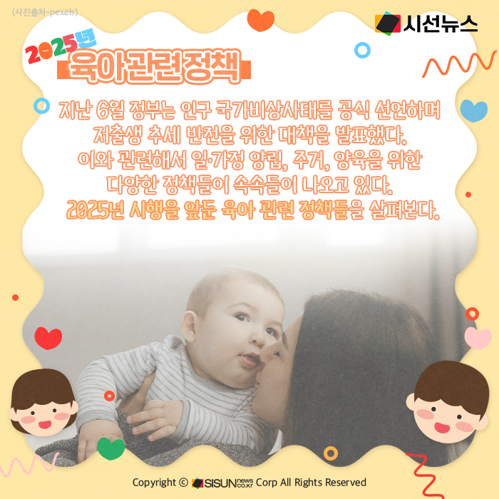 시선뉴스=양원민 기자 / 디자이=김선희 proㅣ지난 6월 정부는 인구 국가비상사태를 공식 선언하며 저출생 추세 반전을 위한 대책을 발표했다. 이와 관련해서 일·가정 양립, 주거, 양육을 위한 다양한 정책들이 속속들이 나오고 있다. 2025년 시행을 앞둔 육아 관련 정책들을 살펴본다.