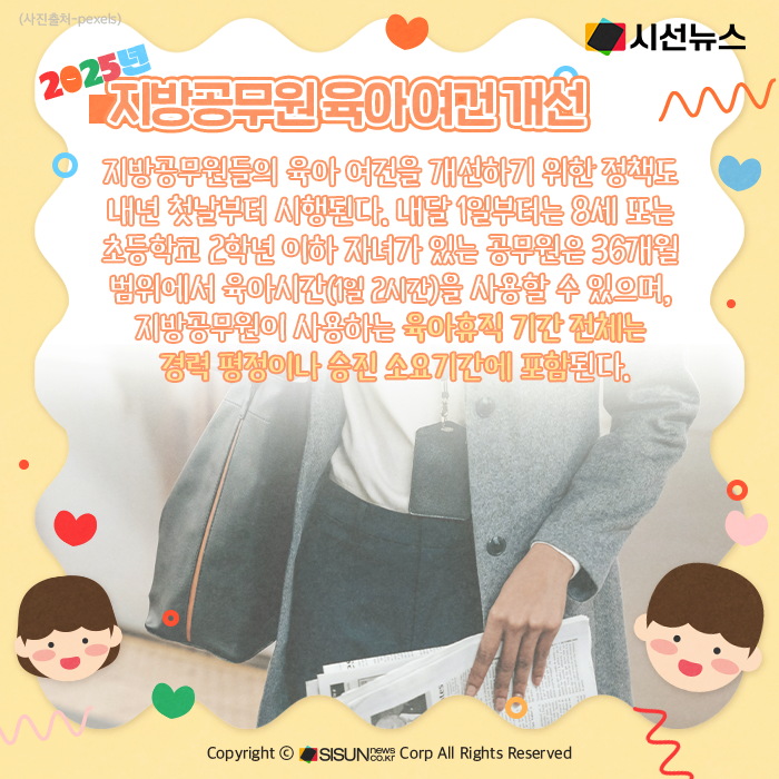 지방공무원들의 육아 여건을 개선하기 위한 정책도 내년 첫날부터 시행된다. 내달 1일부터는 8세 또는 초등학교 2학년 이하 자녀가 있는 공무원은 36개월 범위에서 육아시간(1일 2시간)을 사용할 수 있으며, 지방공무원이 사용하는 육아휴직 기간 전체는 경력 평정이나 승진 소요기간에 포함된다.