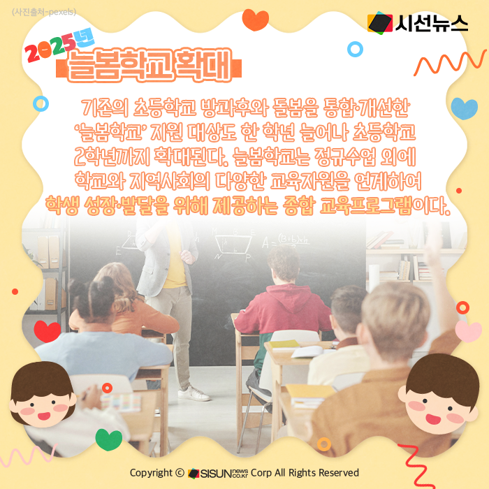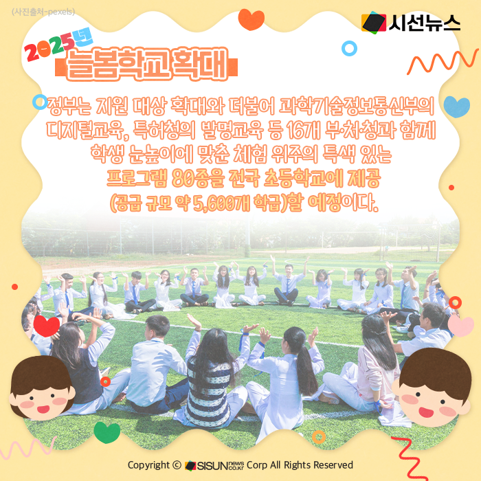기존의 초등학교 방과후와 돌봄을 통합·개선한 ‘늘봄학교’ 지원 대상도 한 학년 늘어나 초등학교 2학년까지 확대된다. 늘봄학교는 정규수업 외에 학교와 지역사회의 다양한 교육자원을 연계하여 학생 성장·발달을 위해 제공하는 종합 교육프로그램이다. 정부는 지원 대상 확대와 더불어 과학기술정보통신부의 디지털교육, 특허청의 발명교육 등 16개 부·처·청과 함께 학생 눈높이에 맞춘 체험 위주의 특색 있는 프로그램 80종을 전국 초등학교에 제공(공급 규모 약 5,600개 학급)할 예정이다.