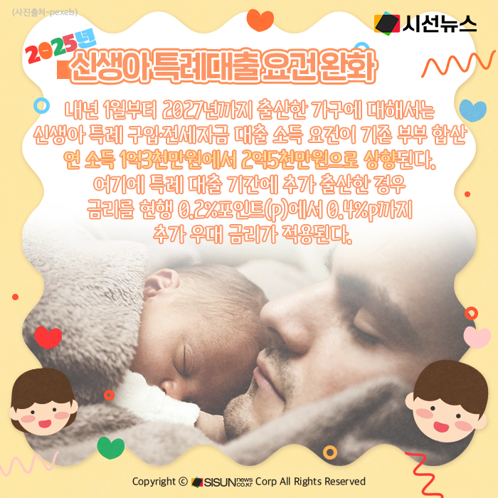 내년 1월부터 2027년까지 출산한 가구에 대해서는 신생아 특례 구입·전세자금 대출 소득 요건이 기존 부부 합산 연 소득 1억3천만원에서 2억5천만원으로 상향된다. 여기에 특례 대출 기간에 추가 출산한 경우 금리를 현행 0.2%포인트(p)에서 0.4%p까지 추가 우대 금리가 적용된다.