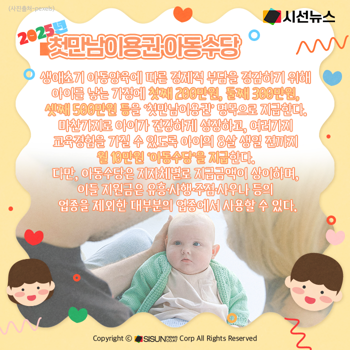 정부는 생애초기 아동양육에 따른 경제적 부담을 경감하기 위해 아이를 낳는 가정에 첫째 200만원, 둘째 300만원, 셋째 500만원 등을 ‘첫만남이용권’ 명목으로 지급한다. 마찬가지로 아이가 건강하게 성장하고, 여러가지 교육경험을 가질 수 있도록 아이의 8살 생일 전까지 월 10만원 ‘아동수당’을 지급한다. 다만, 아동수당은 지자체별로 지급금액이 상이하며, 이들 지원금은 유흥·사행·주점·사우나 등의 업종을 제외한 대부분의 업종에서 사용할 수 있다.