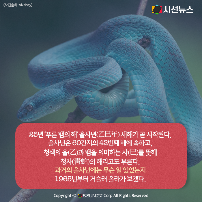 시선뉴스=정혜인 기자ㅣ2025년 ‘푸른 뱀의 해’ 을사년(乙巳年) 새해가 곧 시작된다. 을사년은 60간지의 42번째 해에 속하고, 청색의 을(乙)과 뱀을 의미하는 사(巳)를 뜻해 청사(靑蛇)의 해라고도 부른다. 과거의 을사년에는 무슨 일 있었는지 1965년부터 거슬러 올라가 보겠다.