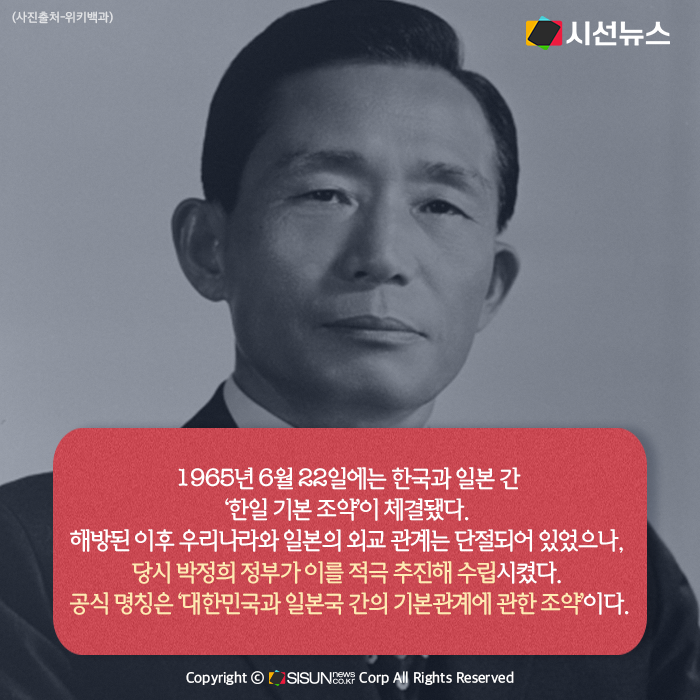 1965년 6월 22일에는 한국과 일본 간 ‘한일 기본 조약’이 체결됐다. 해방된 이후 우리나라와 일본의 외교 관계는 단절되어 있었으나, 당시 박정희 정부가 이를 적극 추진해 수립시켰다. 공식 명칭은 ‘대한민국과 일본국 간의 기본관계에 관한 조약’으로, 오늘날 한일 양국에서 해석 차이가 빚어지고 있다.