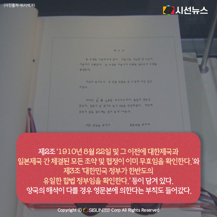제2조 ‘1910년 8월 22일 및 그 이전에 대한제국과 일본제국 간 체결된 모든 조약 및 협정이 이미 무효임을 확인한다.’와 제3조 ‘대한민국 정부가 한반도의 유일한 합법 정부임을 확인한다.’ 등이 담겨 있다. 이 외에 양국의 수교를 인정하는 내용과 양국의 해석이 다를 경우 영문본에 의한다는 부칙이 들어갔다.