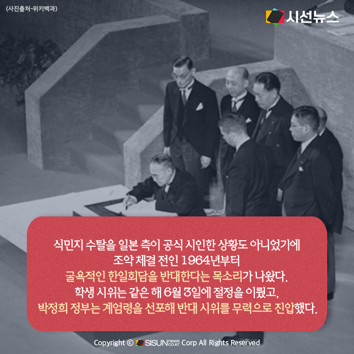 식민지 수탈을 일본 측이 공식 시인한 상황도 아니었기에 조약 체결 전인 1964년부터 굴욕적인 한일회담을 반대한다는 목소리가 나왔다. 학생 시위는 같은 해 6월 3일에 절정을 이뤘고, 박정희 정부는 계엄령을 선포해 반대 시위를 무력으로 진압했다.