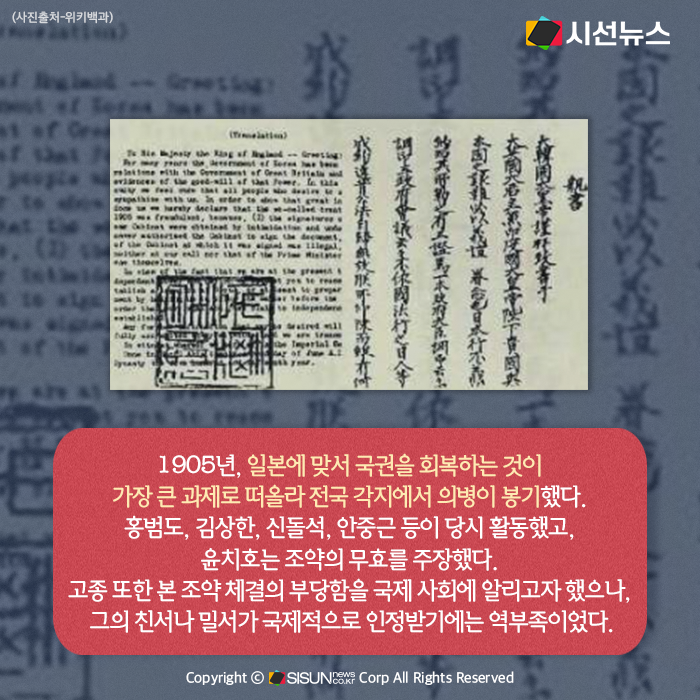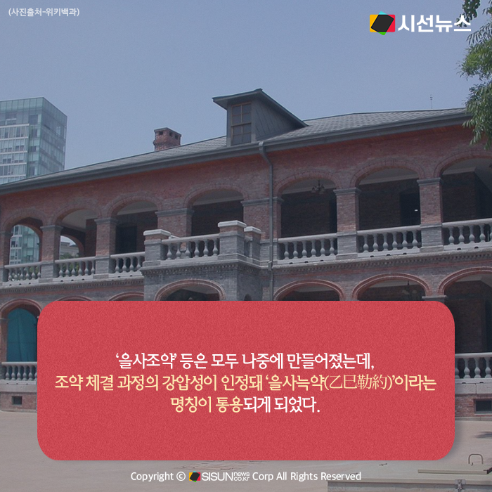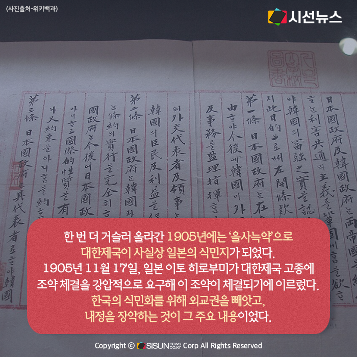 한 번 더 거슬러 올라간 1905년에는 ‘을사늑약’으로 대한제국이 사실상 일본의 식민지가 되었다. 1905년 11월 17일, 일본 이토 히로부미가 대한제국 고종에 조약 체결을 강압적으로 요구해 이 조약이 체결되기에 이르렀다. 한국의 식민화를 위해 외교권을 빼앗고, 내정을 장악하는 것이 그 주요 내용이었다.