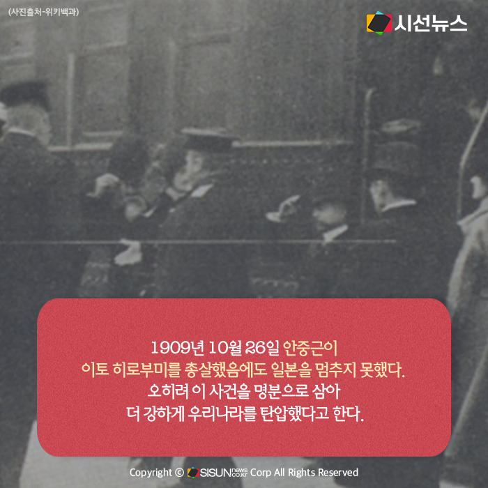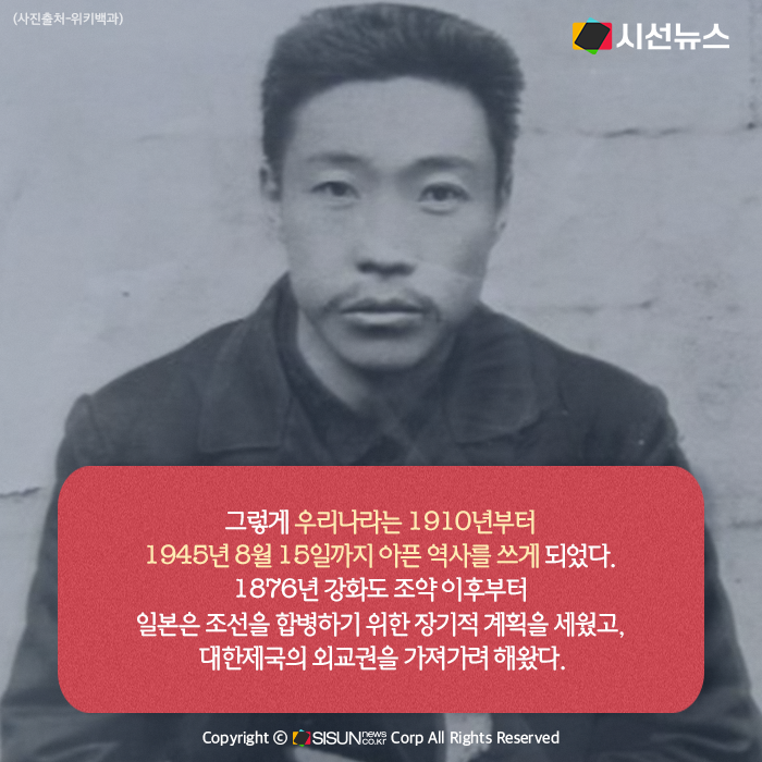 그렇게 우리나라는 1910년부터 1945년 8월 15일까지 아픈 역사를 쓰게 되었다. 1876년 강화도 조약 이후부터 일본은 조선을 합병하기 위한 장기적 계획을 세웠고, 대한제국의 외교권을 가져가려 해왔다. 1909년 10월 26일 안중근이 이토 히로부미를 총살했음에도 일본을 멈추지 못했다. 오히려 이 사건을 명분으로 삼아 더 강하게 우리나라를 탄압했다고 한다.