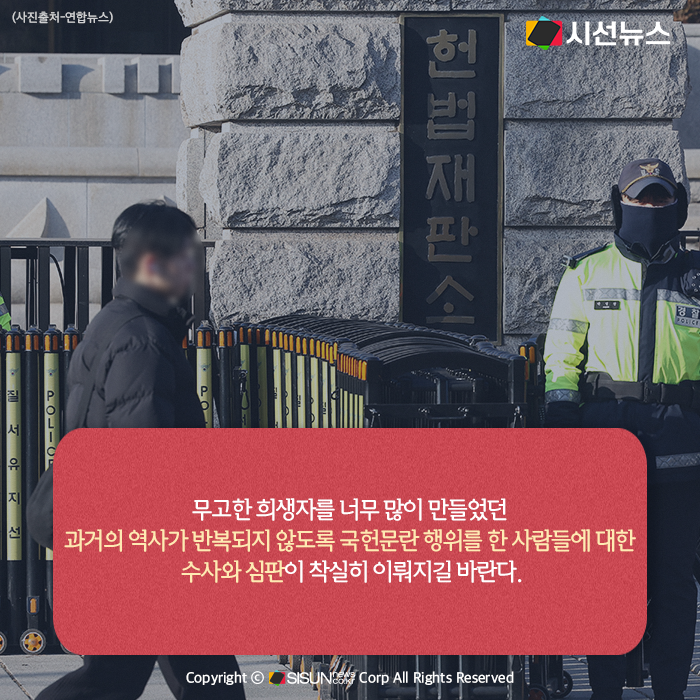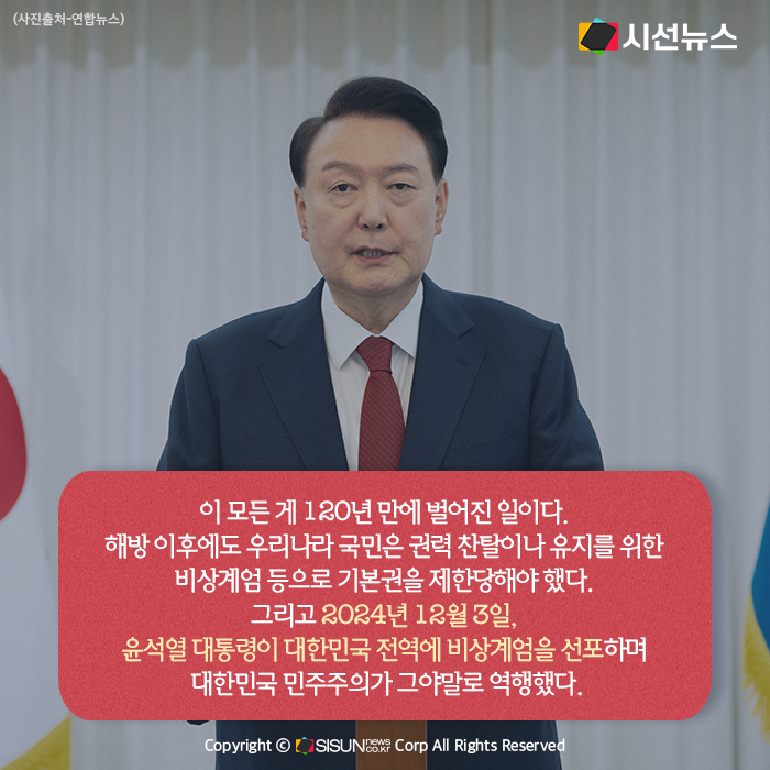 이 모든 게 120년 만에 벌어진 일이다. 해방 이후에도 우리나라 국민은 권력 찬탈이나 유지를 위한 비상계엄 등으로 기본권을 제한당해야 했다. 그리고 2024년 12월 3일, 윤석열 대통령이 대한민국 전역에 비상계엄을 선포하며 대한민국 민주주의가 그야말로 역행했다. 무고한 희생자를 너무 많이 만들었던 과거의 역사가 반복되지 않도록 국헌문란 행위를 한 사람들에 대한 수사와 심판이 착실히 이뤄지길 바란다.