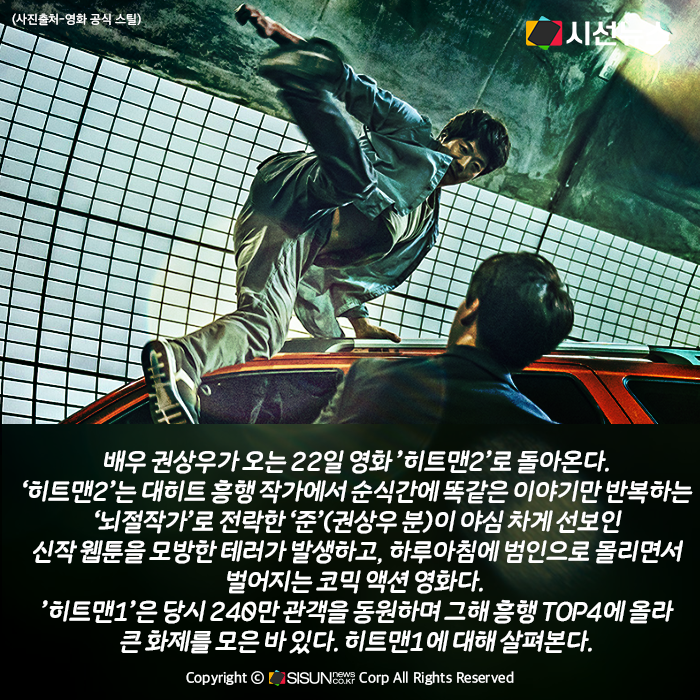 배우 권상우가 오는 22일 영화 '히트맨2'로 돌아온다. '히트맨2'는 대히트 흥행 작가에서 순식간에 똑같은 이야기만 반복하는 ‘뇌절작가’로 전락한 ‘준’(권상우 분)이 야심 차게 선보인 신작 웹툰을 모방한 테러가 발생하고, 하루아침에 범인으로 몰리면서 벌어지는 코믹 액션 영화다. '히트맨1'은 당시 240만 관객을 동원하며 그해 흥행 TOP4에 올라 큰 화제를 모은 바 있다. 히트맨1에 대해 살펴본다.