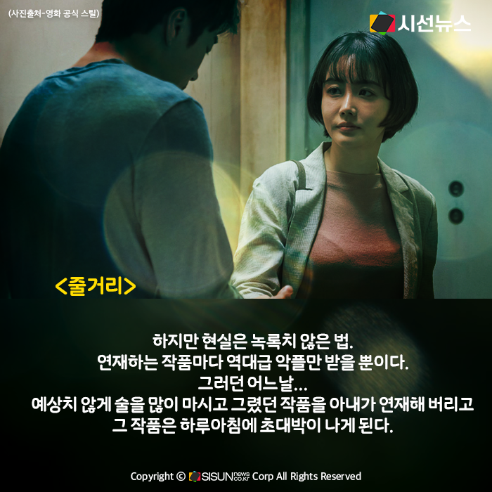 하지만 현실은 녹록치 않은 법. 연재하는 작품마다 역대급 악플만 받을 뿐이다. 그러던 어느날... 예상치 않게 술을 많이 마시고 그렸던 작품을 아내가 연재해 버리고 그 작품은 하루아침에 초대박이 나게 된다.