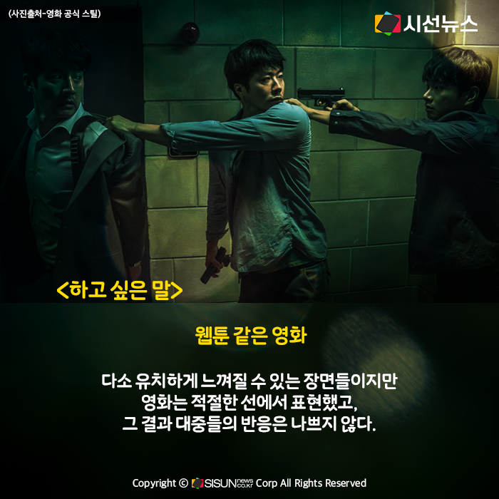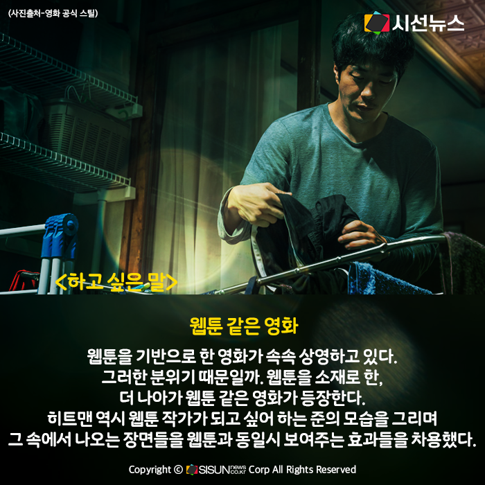 웹툰을 기반으로 한 영화가 속속 상영하고 있다. 그러한 분위기 때문일까. 웹툰을 소재로 한, 더 나아가 웹툰 같은 영화가 등장한다. 히트맨 역시 웹툰 작가가 되고 싶어 하는 준의 모습을 그리며 그 속에서 나오는 장면들을 웹툰과 동일시 보여주는 효과들을 차용했다. 다소 유치하게 느껴질 수 있는 장면들이지만 영화는 적절한 선에서 표현했고, 그 결과 대중들의 반응은 나쁘지 않다.
