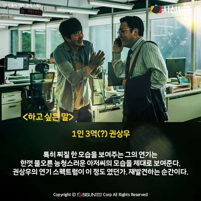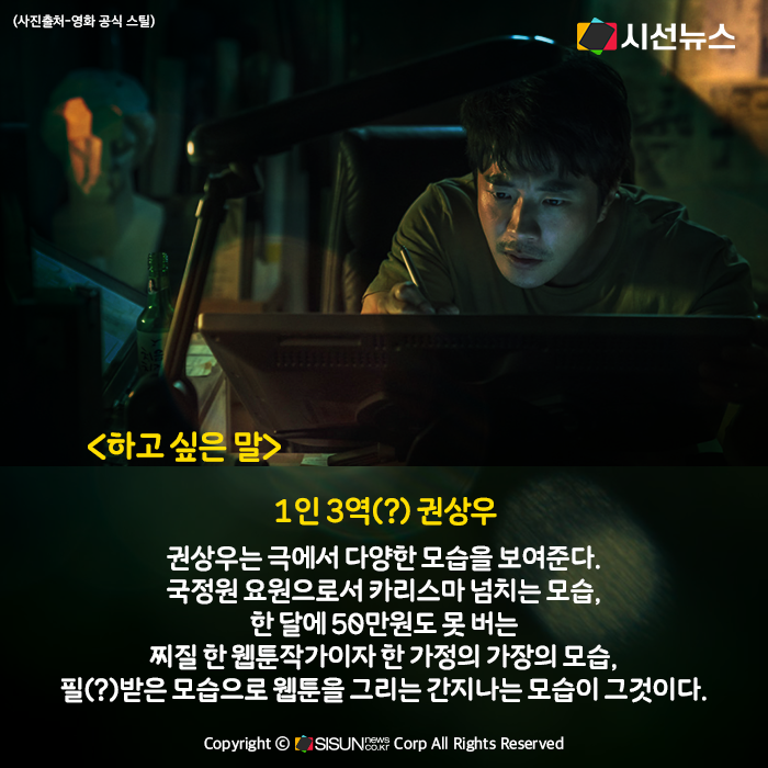 권상우는 극에서 다양한 모습을 보여준다. 국정원 요원으로서 카리스마 넘치는 모습, 한 달에 50만원도 못 버는 찌질 한 웹툰작가이자 한 가정의 가장의 모습, 필(?)받은 모습으로 웹툰을 그리는 간지나는 모습이 그것이다. 특히 찌질 한 모습을 보여주는 그의 연기는 한껏 물오른 능청스러운 아저씨의 모습을 제대로 보여준다. 권상우의 연기 스펙트럼이 이 정도 였던가. 재발견하는 순간이다.