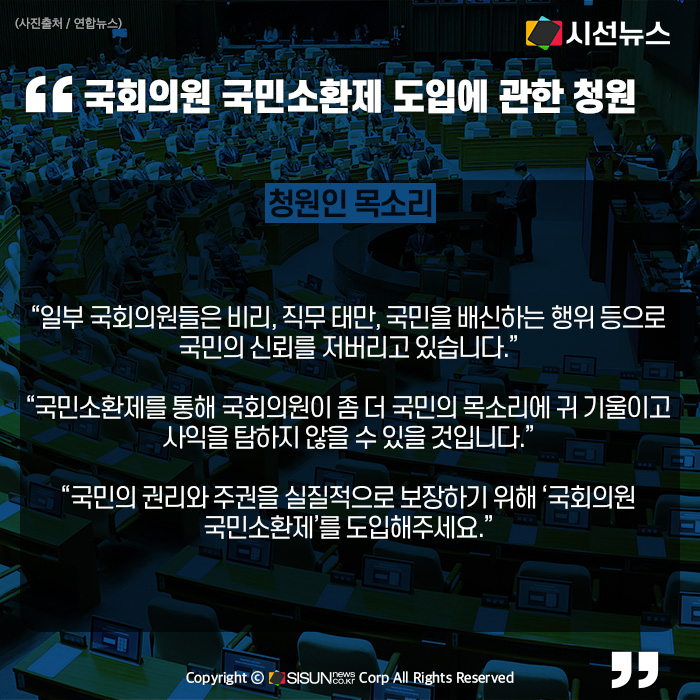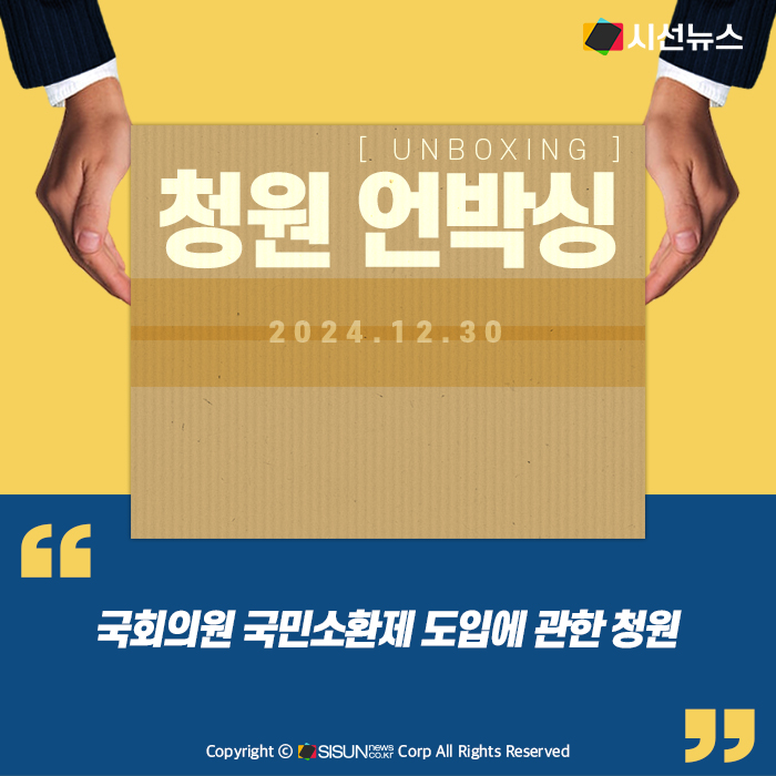 시선뉴스=양원민 기자ㅣ국회는 일을 해야 마땅하다! 국민이 국회나 국가기관에 대해 자신의 의견이나 희망을 진술하는 국회의 ‘국민동의청원’. 그 중에 이슈가 되는 사안, 또는 이슈가 되어야 할 사안을 언박싱 해본다.