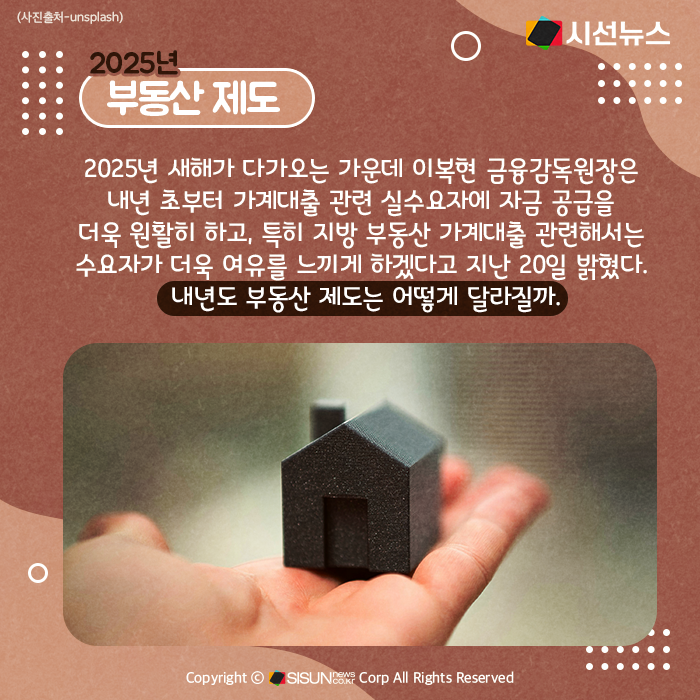시선뉴스=정혜인 기자 / 디자인=김선희 proㅣ2025년 새해가 다가오는 가운데 이복현 금융감독원장은 내년 초부터 가계대출 관련 실수요자에 자금 공급을 더욱 원활히 하고, 특히 지방 부동산 가계대출 관련해서는 수요자가 더욱 여유를 느끼게 하겠다고 지난 20일 밝혔다. 이 원장은 이날 서울 여의도 주택건설회관에서 열린 건설업계 및 부동산시장 전문가 간담회에서 이같이 말했다.